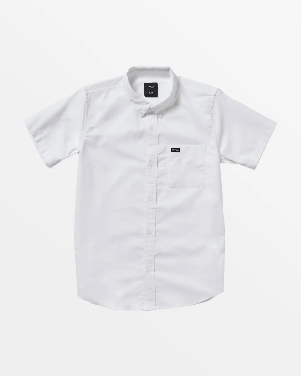 This slim fit, button-down boy’s short-sleeve shirt from RVCA has everything your little ripper needs in a casual day shirt. Made from a comfortable cotton-poly stretch oxford fabric with a single chest pocket, short sleeves and collar neck, the That’ll Do shirt allows full range of movement while keeping its shape. Featured here in the White colorway.