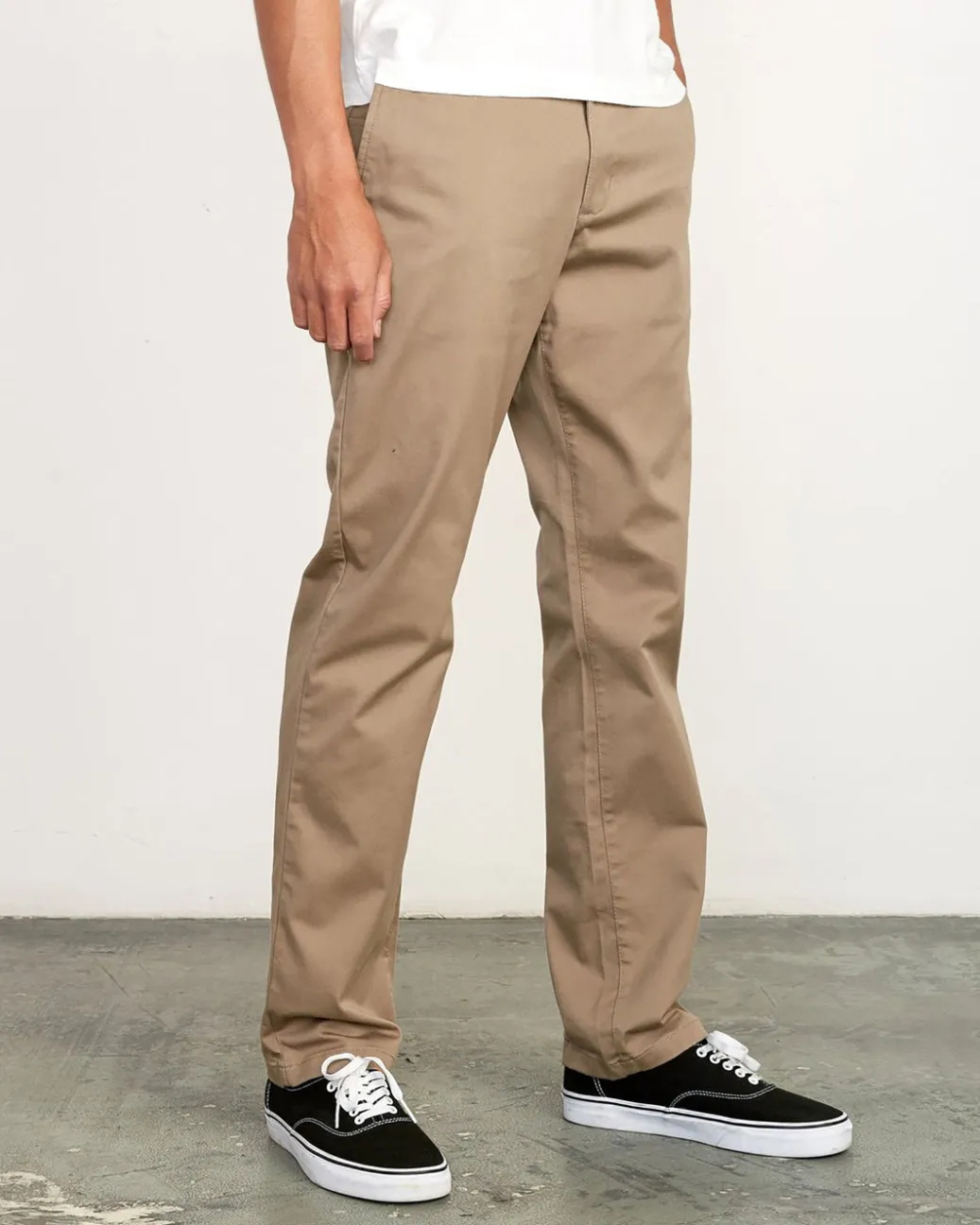 A classic, straight fit that’s stretchy and comfortable. The RVCA Weekend has everything you want in a pant. Crafted from durable and resistant fabric, these men’s pants feature a zipper fly, button closure, front coin pocket, front slash pockets, and back welt pockets with signature RVCA solo labeling. Featured here in the Dark Khaki colorway.