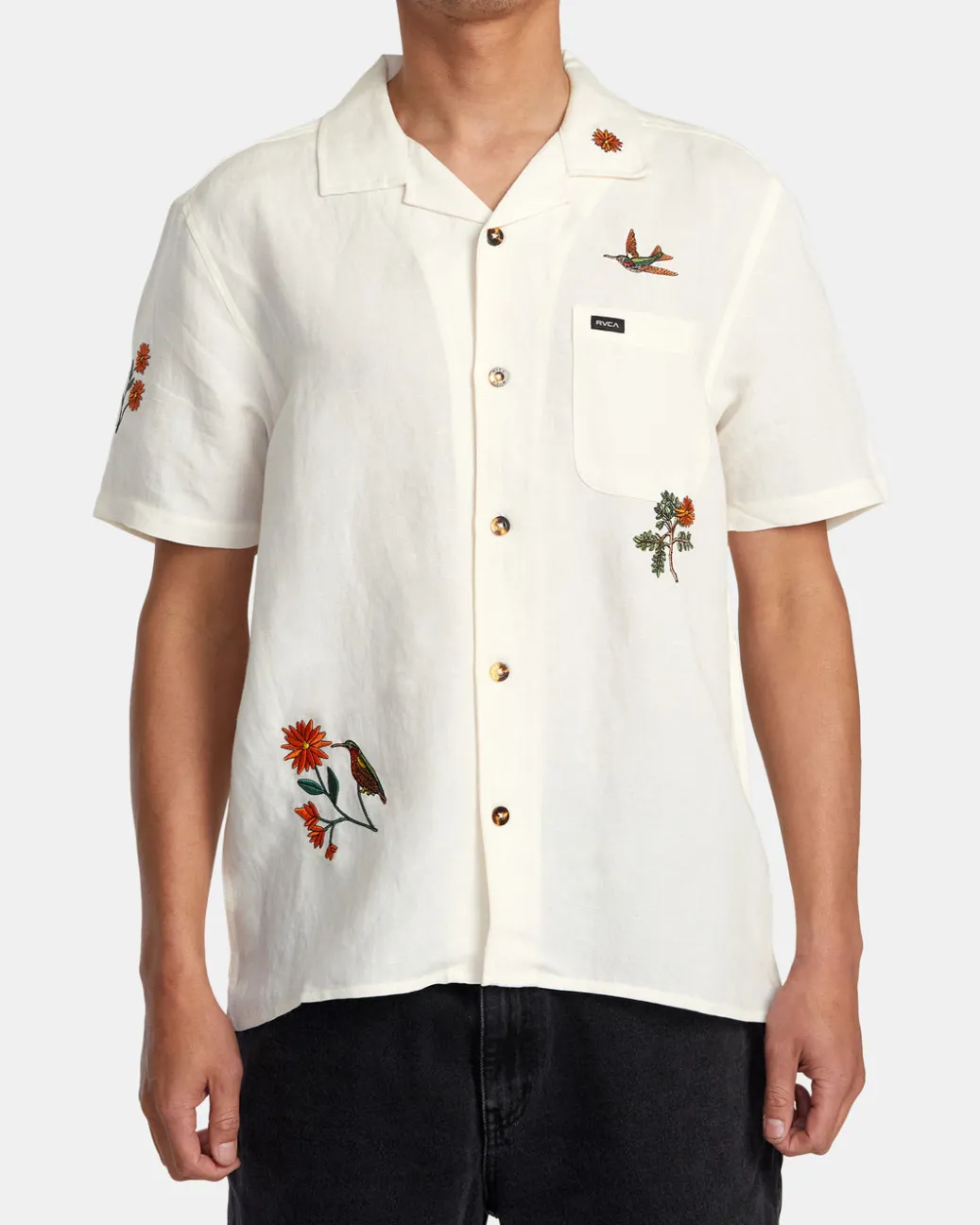 Step up your style game with RVCA’s Nectar Short Sleeve Woven Shirt. Crafted from a lightweight linen-viscose blend fabric in a slightly relaxed fit for easy wear, this button-up shirt features a traditional collar neck, a single chest pocket, and a scalloped hem. Placement graphics throughout add an eye-catching look. Featured here in the Natural colorway.