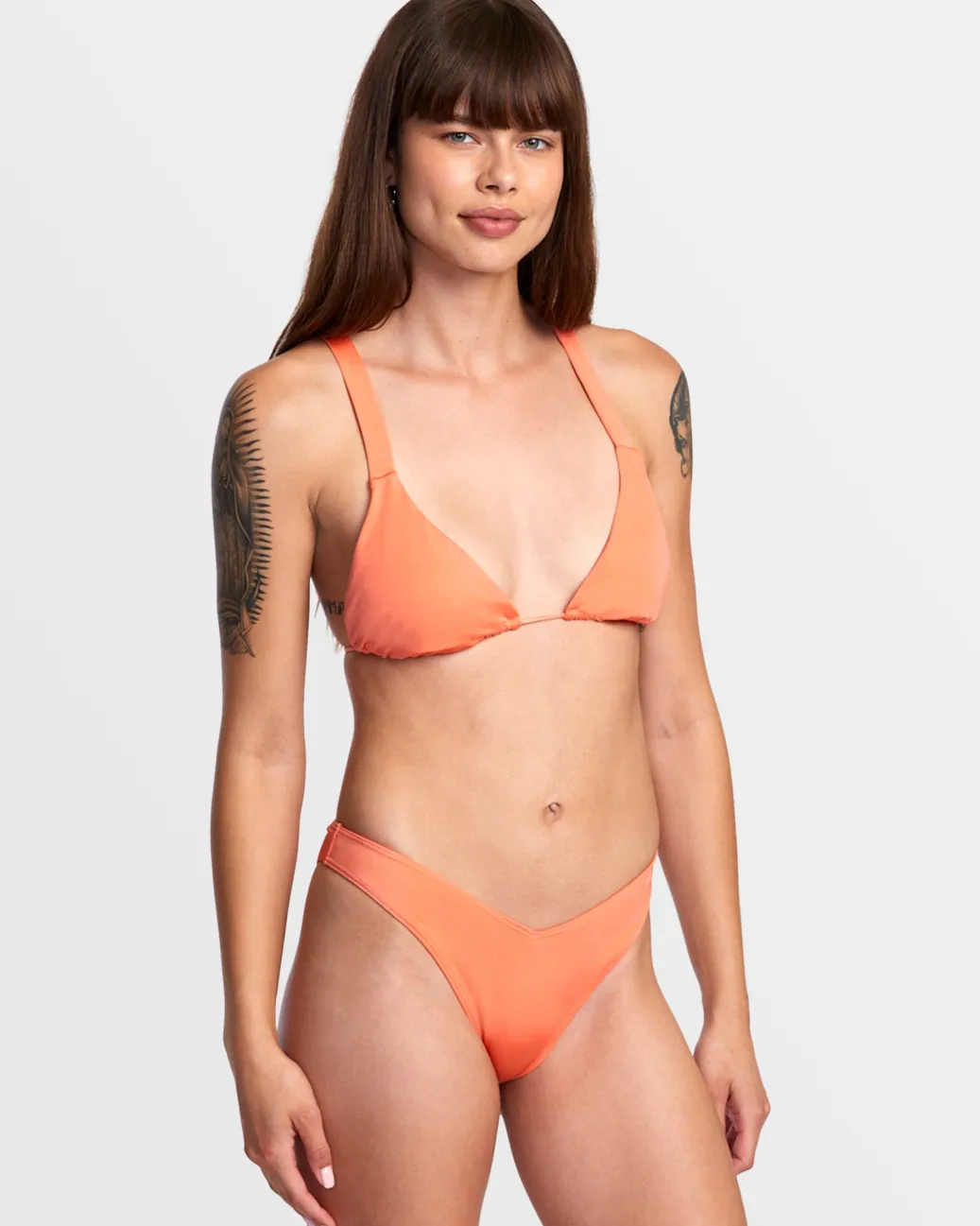 Add some sparkle to your swim collection with RVCA’s Solid Shimmer Wide Crossback Triangle Bikini Top. With its high-sheen partially recycled fabric, this sporty swim top updates a classic slide triangle swim top with wider straps that cross and tie at the back for superior comfort, support, and modern style. Featured here in the Fusion Coral colorway.