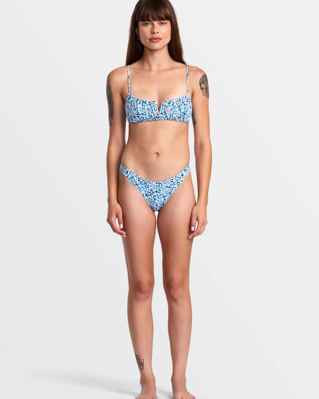 Crafted of partially recycled nylon, RVCA’s Sprinkles V-Wire Bralette Bikini Top brings a modern touch to a timeless style. This fashion swim top features a fresh floral print, deep V-neck, and adjustable straps. Featured here in the Black Floral colorway.