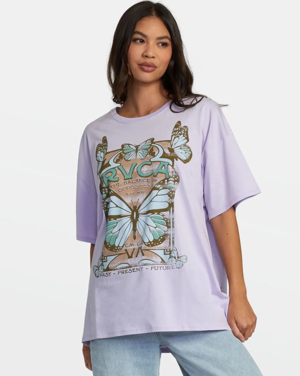 The Social Butter Fly oversized tee pairs lightweight organic cotton construction with a bold chest graphic in pigment-dyed ink to give it a vintage look. Featured here in the Pastel Lilac colorway.