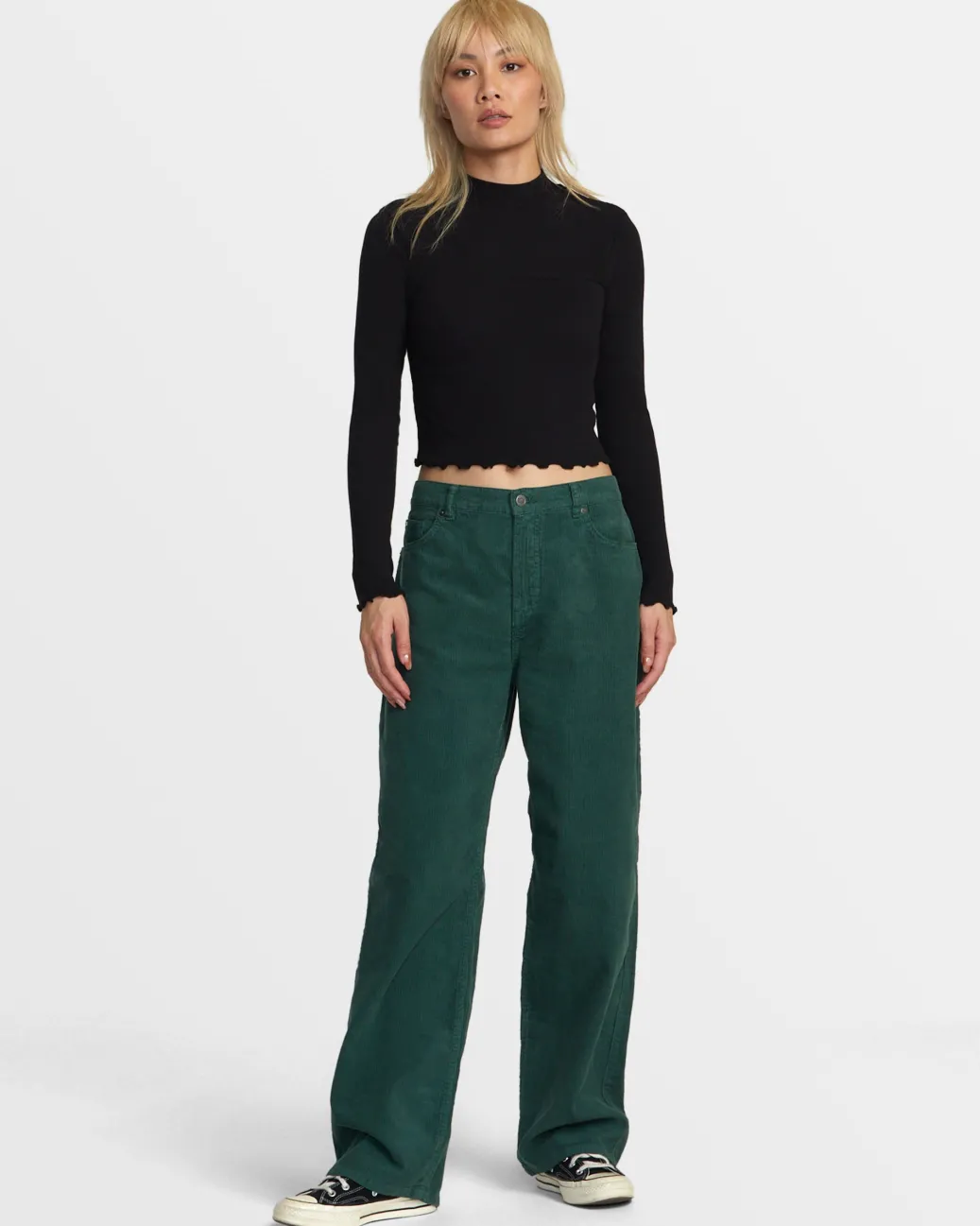 Made of ribbed stretch-knit fabric, this long-sleeve cropped top has a fitted shape with a mock neck, a lettuce hem, and seaming detail across the chest. Featured here in the Black colorway.