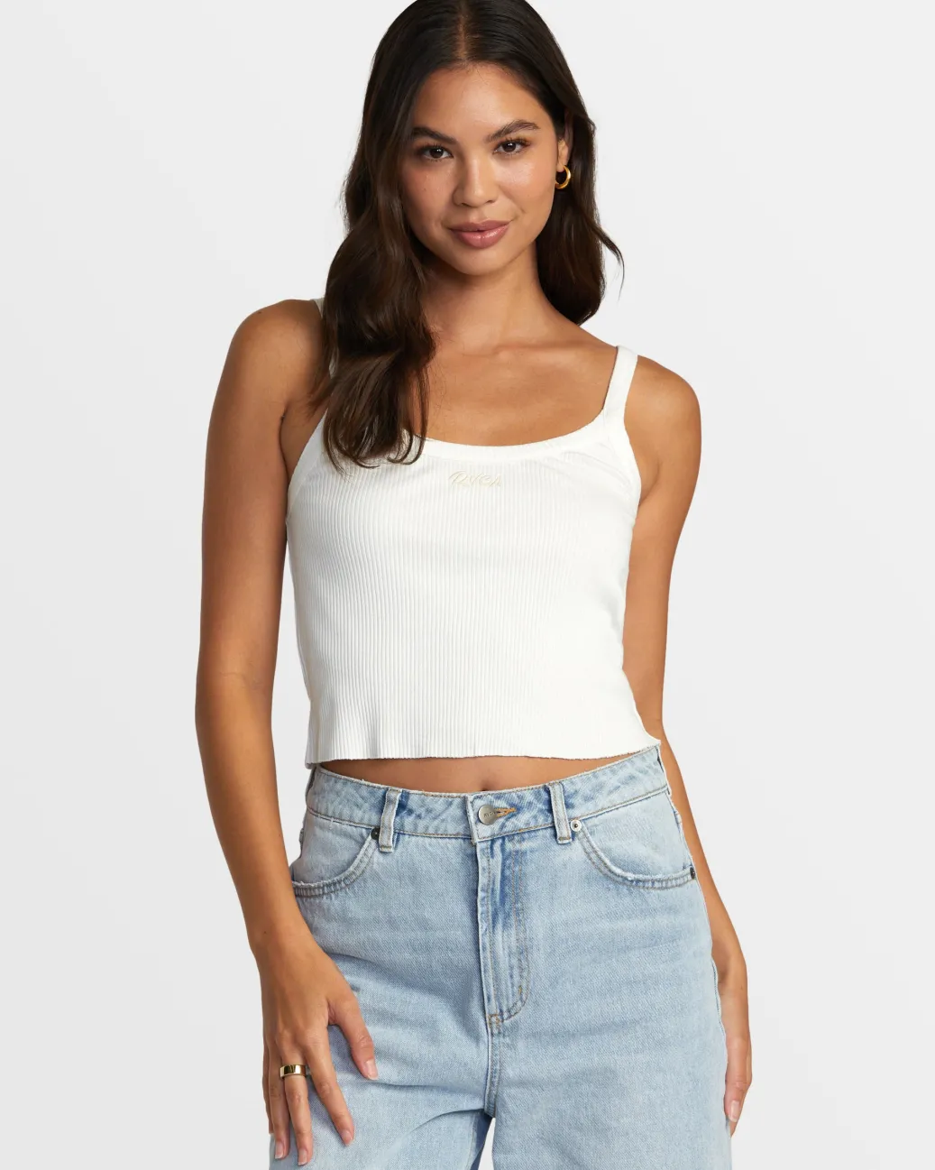 The Westside Crop Top from RVCA brings a sporty touch to your warm-weather basics. Crafted from a breathable viscose elastane blend fabric, this scoop neck cropped tank features fixed straps and an embroidered logo at the center front for a subtle brand statement. Featured here in the Whisper White colorway.