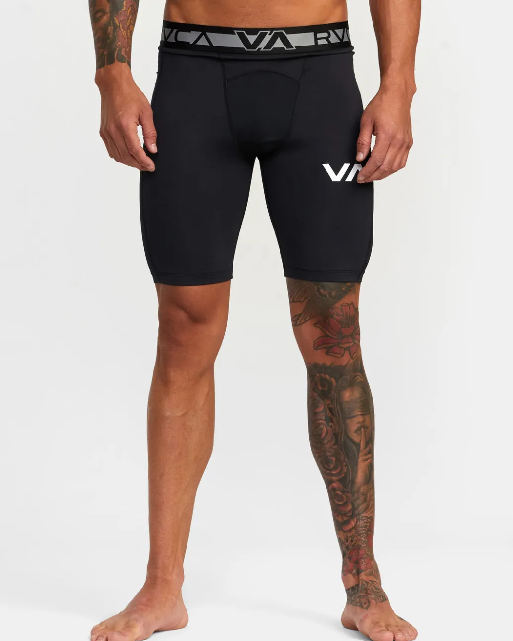 With minimal branding on the waistband and leg, these VA Sport compression shorts combine 4-way stretch freedom, moisture-wicking comfort, and antimicrobial tech for the ultimate training essential. Featured here in the Black colorway.