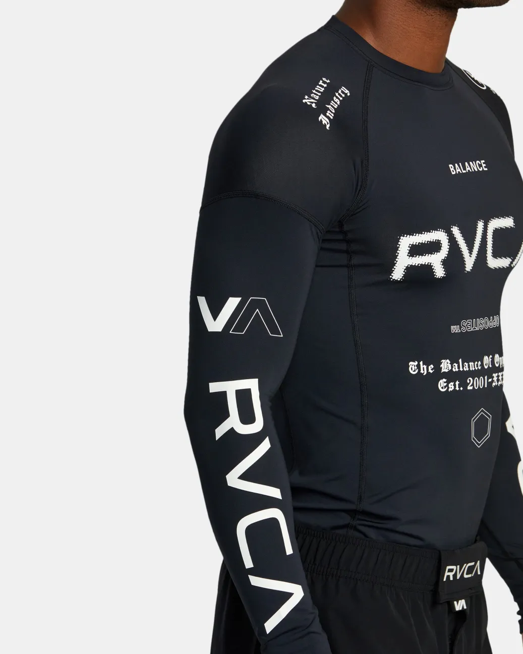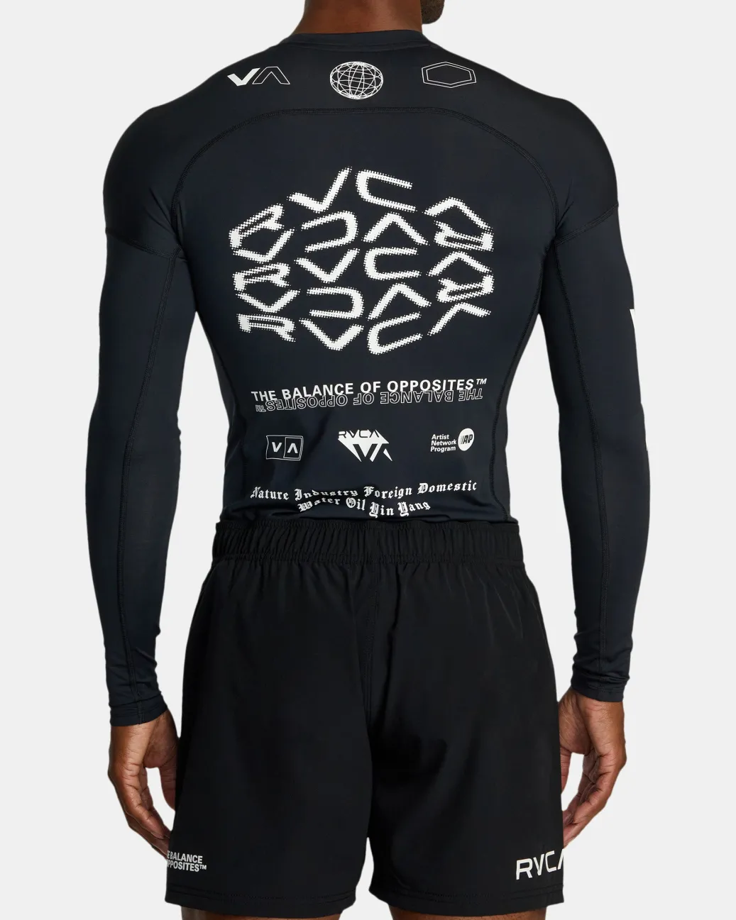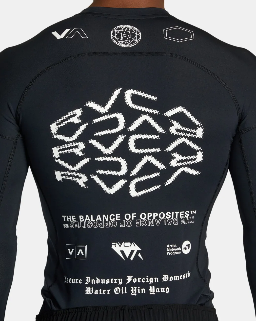 Made of stretchy and strong recycled fabric, this VA Sport long-sleeve rashguard has a fitted shape with raglan sleeves for better mobility. Comes in a range of fresh prints and colorways. Featured here in the Black All Brand 2 colorway.