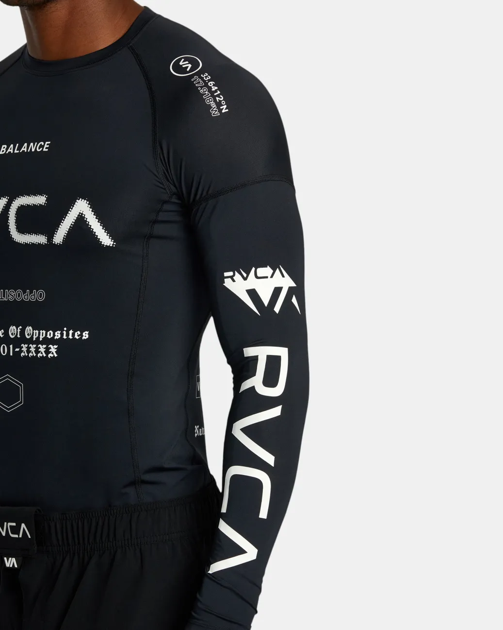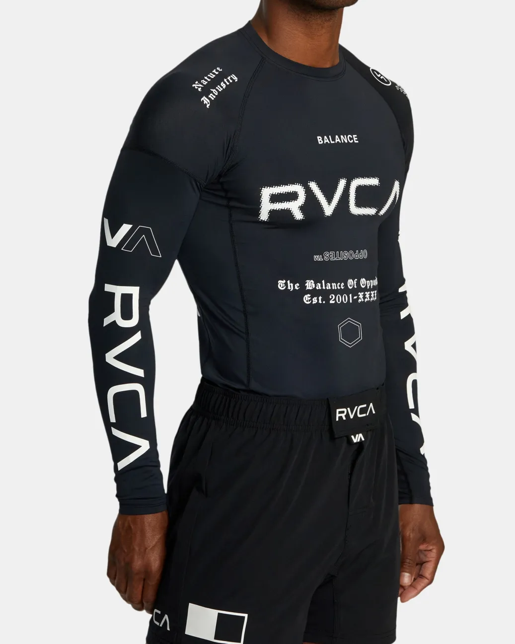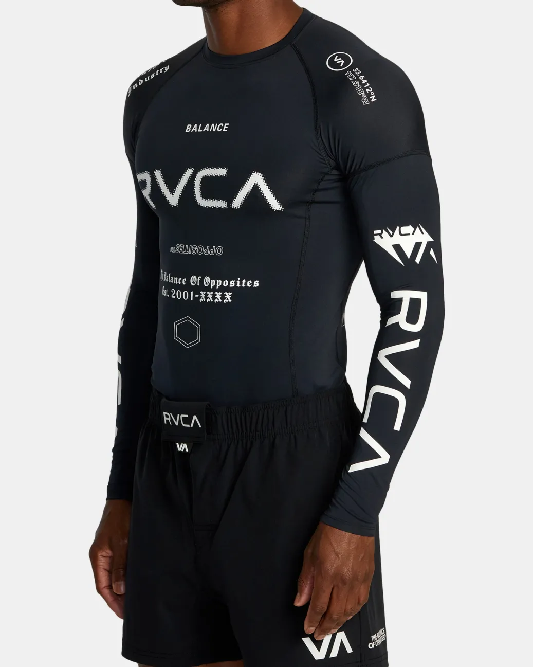 Made of stretchy and strong recycled fabric, this VA Sport long-sleeve rashguard has a fitted shape with raglan sleeves for better mobility. Comes in a range of fresh prints and colorways. Featured here in the Black All Brand 2 colorway.