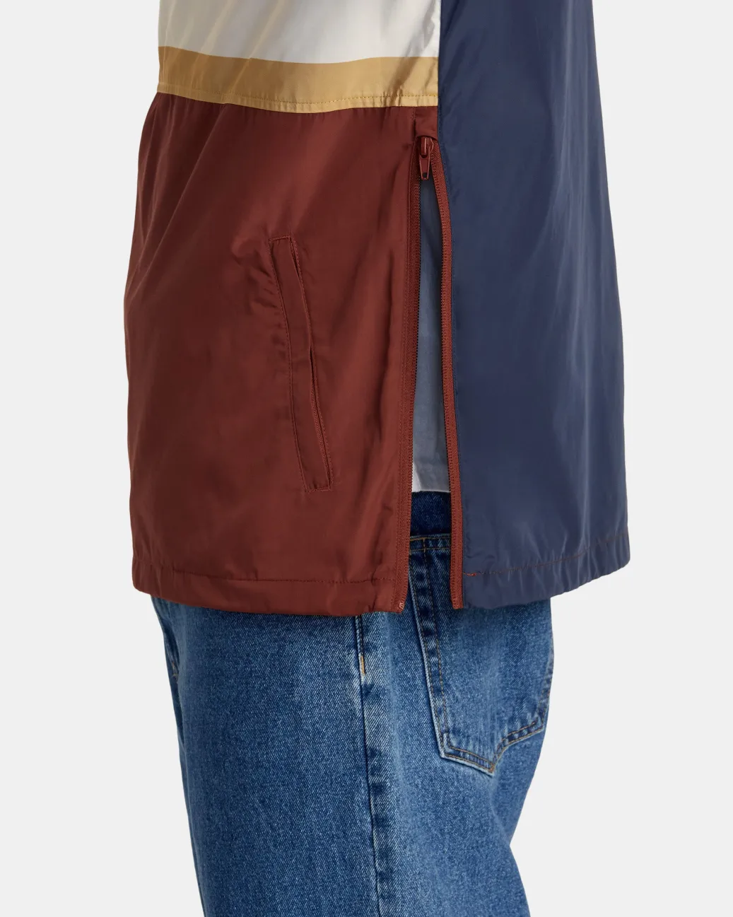 The Meyer II lightweight anorak jacket from RVCA delivers protection from the elements with functional features and sporty style. The polyester taffeta fabric has a water-resistant coating for protection from wind and light rain, while the extended hood collar and long sleeves provide coverage. A center front half zipper with placket and two hidden zip pockets keep essentials secure. Featured here in the Moody Blue colorway.