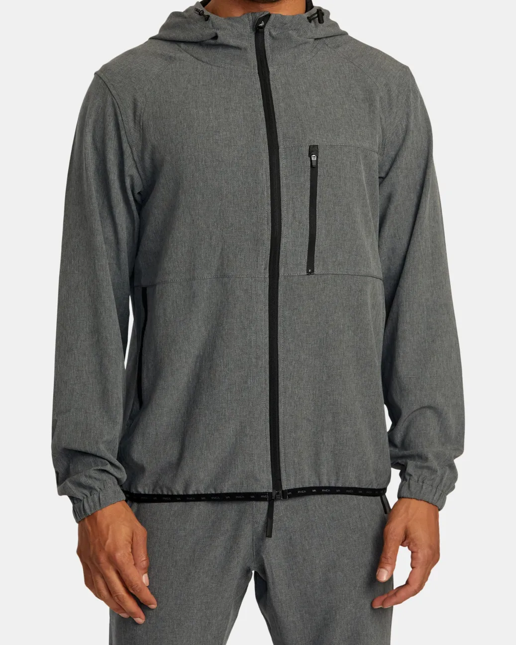 The RVCA Yogger Zip-Up Hooded Jacket II offers ultimate protection and style for days. Made from premium 4-Way Stretch, this men’s hooded jacket features a front zip closure, elastic hem and cuffs, adjustable toggles at the hood and pockets throughout for your needs. Topped with VA branding. Featured here in the Charcoal Heather colorway.