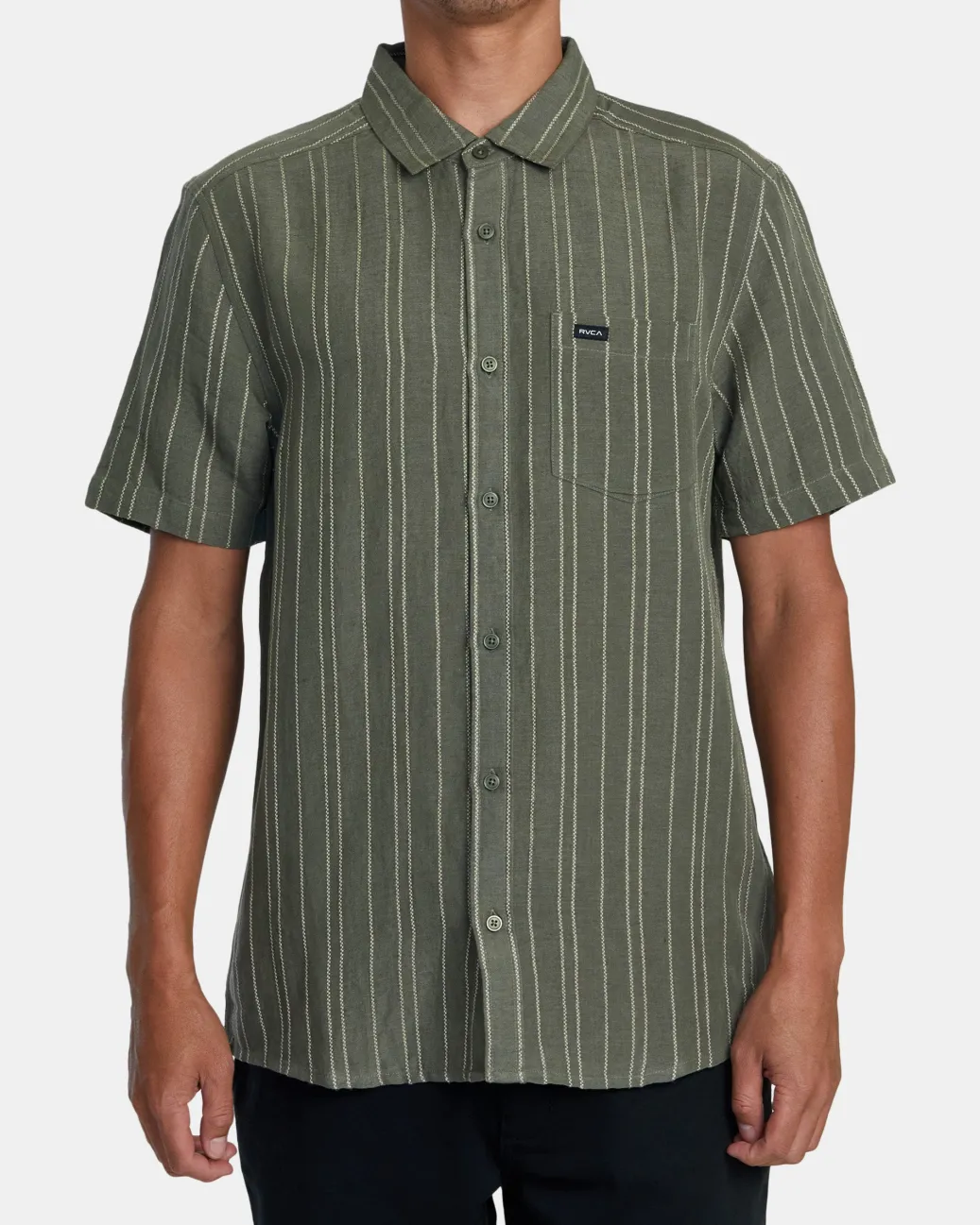 Go for a timeless look with RVCA’s Mercy Stripe Short Sleeve Woven Shirt. Crafted from a linen-viscose fabric to keep it feeling soft and light, this printed button-up shirt features a regular fit, a traditional collar neck, and a single chest pocket. Finished with scalloped hem and RVCA solo label at the chest. Featured here in the Olivine colorway.
