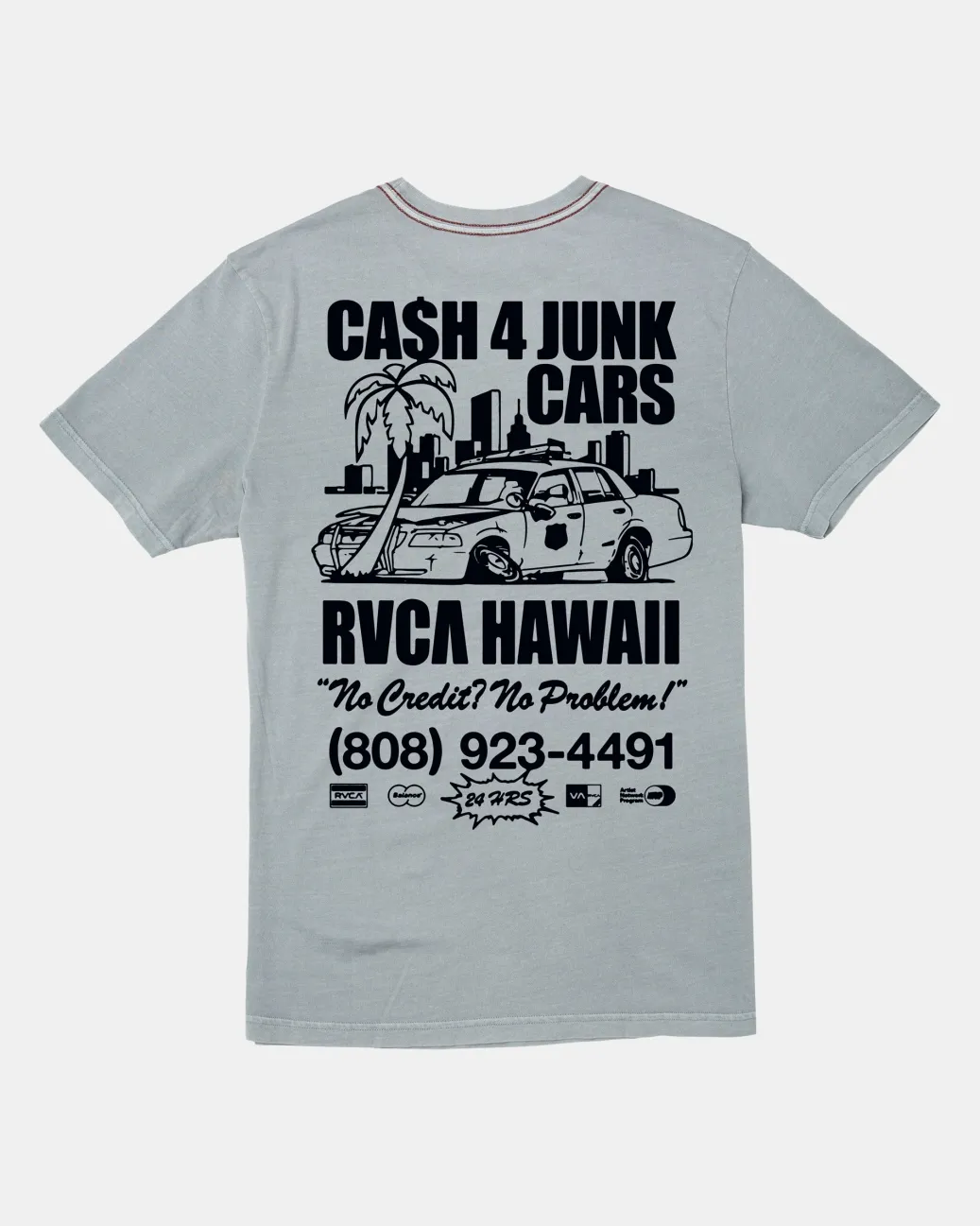 The Cash For Junk tee is a hidden treasure crafted of pigment-dyed cotton fabric to give it a soft, breathable feel and a vintage look. Featuring Hawaii Collection artwork, this slim-fit t-shirt has a narrower cut and our trademark RVCA red stitching. Featured here in the Monument colorway.