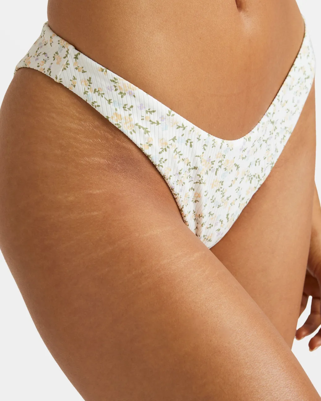 Perfect for those who want a flattering look without baring it all, the Ditsy moderate coverage bikini bottoms are made of partially recycled nylon rib fabric with a low waist and a medium seat cut. Featured here in the Whisper White colorway.