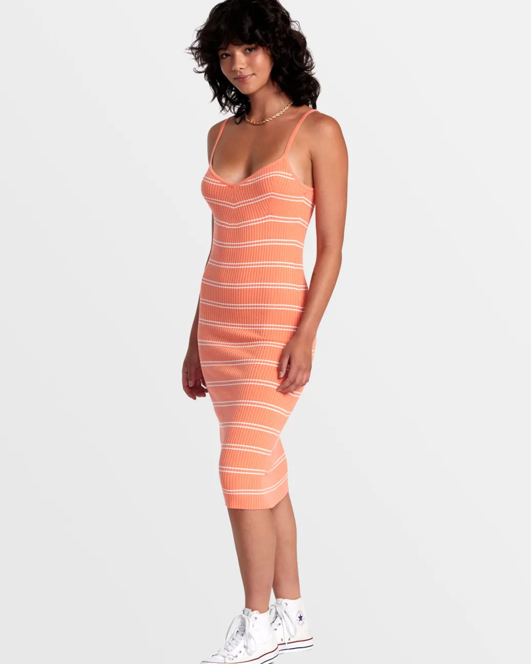 An effortless beauty with a warm-weather feel, RVCA Women’s Silhouette is a bodycon sweater dress crafted of blended knit with contrast stripes. Complete with a sweetheart neckline, this modern midi is a perfect look for day or night. Featured here in the Fusion Coral colorway.