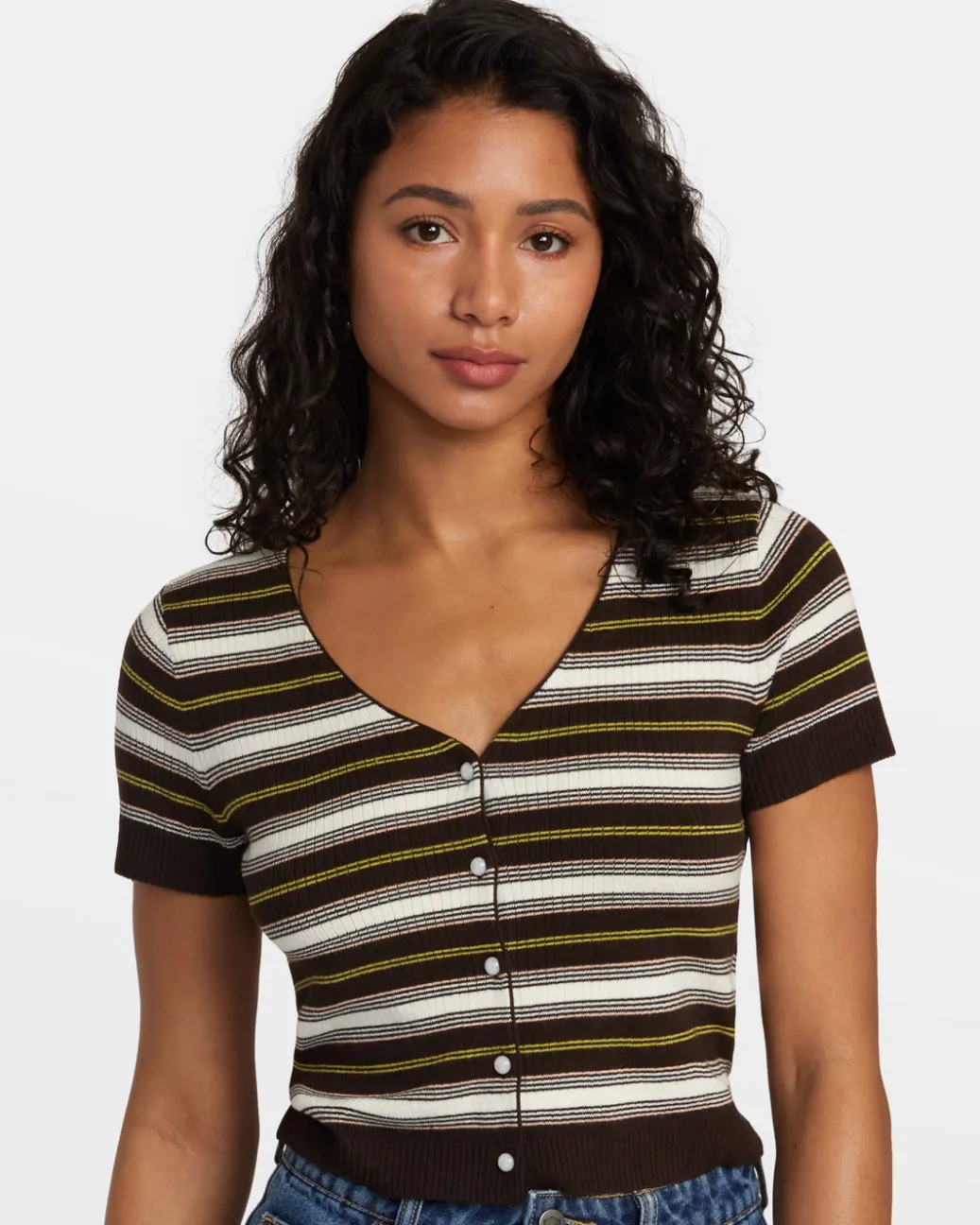 Stay sweater chic all year long with RVCA Women’s Taylor Short-Sleeve Cardigan. This fitted crop top has full front buttons, a scoop neck and striped knit fabric with softness and stretch to perfectly hug your figure. Featured here in the Java colorway.
