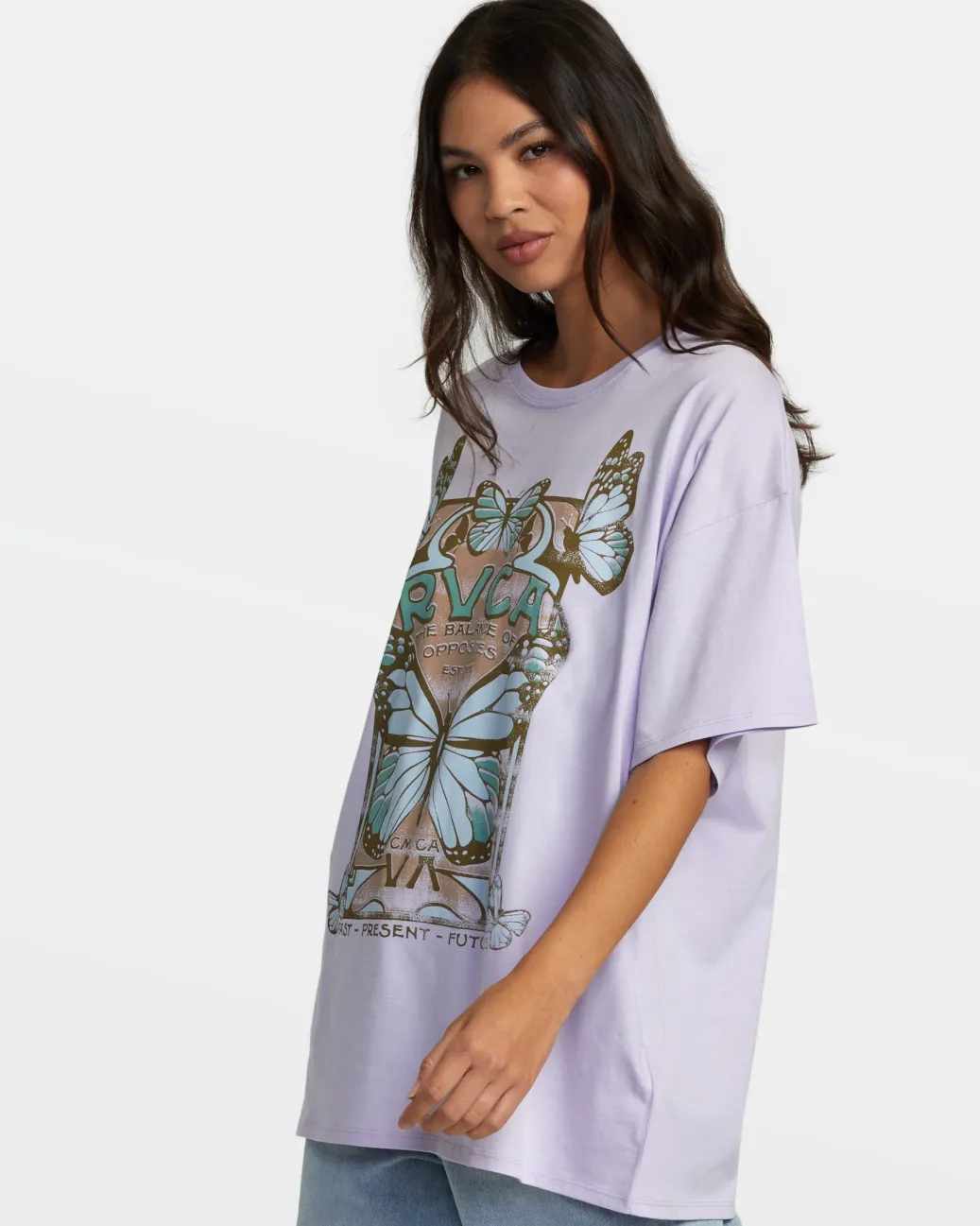 The Social Butter Fly oversized tee pairs lightweight organic cotton construction with a bold chest graphic in pigment-dyed ink to give it a vintage look. Featured here in the Pastel Lilac colorway.