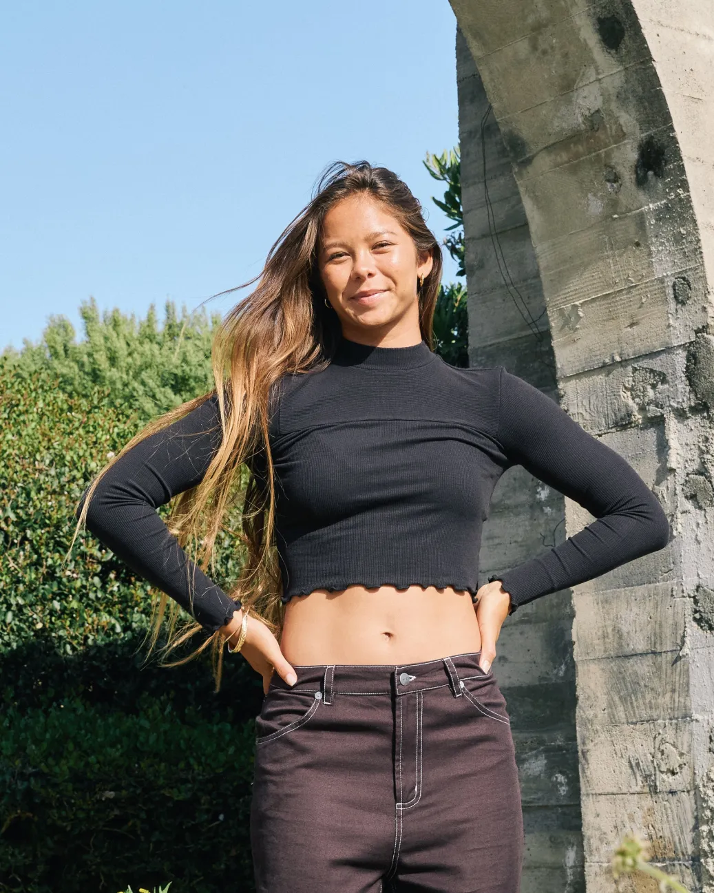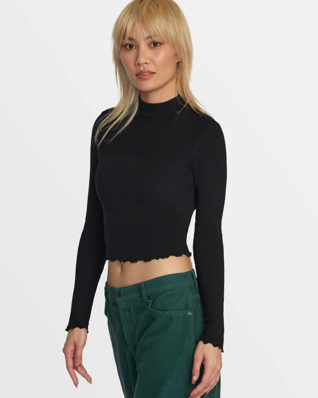 Made of ribbed stretch-knit fabric, this long-sleeve cropped top has a fitted shape with a mock neck, a lettuce hem, and seaming detail across the chest. Featured here in the Black colorway.